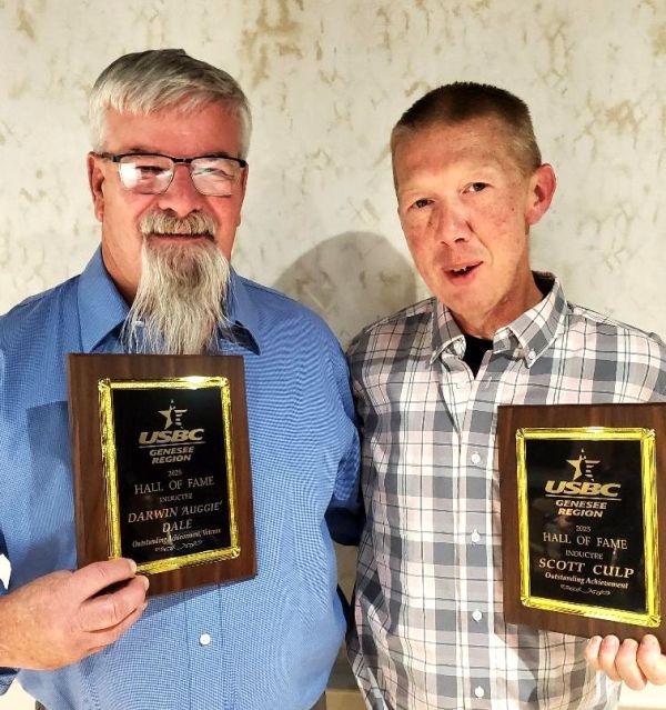 MAY 11, 2025 -- The Genesee Region USBC held its Annual Banquet on Saturday night (May 10) at Batavia Downs Gaming. Eight-nine people attended the event, which was highlighted by the induction of Scott Culp of Honeoye Falls and Darwin "Auggie" Dale of Piffard into the Outstanding Achievement and Outstanding Achievement, Veteran categories, respectively.