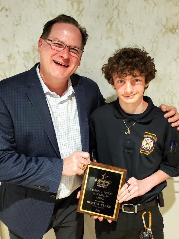 GUEST SPEAKER AND SCHOLARSHIP RECIPIENT: Paul Peck, noted Buffalo sports personality and host of the Beat the Champ TV bowling show, congratulates Hunter Clark, this year's recipient of the Barbara J. Kreiley Scholarship. Hunter plans to attend the SUNY Niagara Culinary Institute and has aspirations of someday becoming a fire chief.